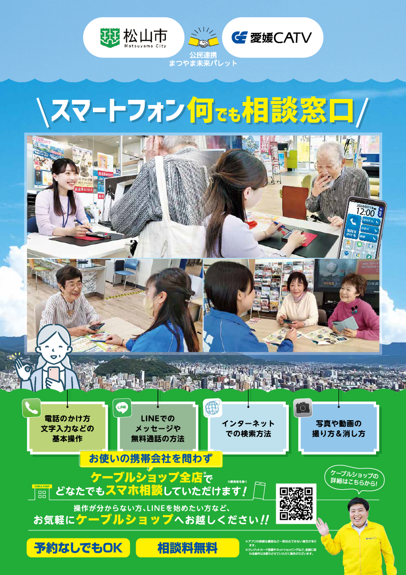 松山市と株式会社愛媛CATVは、誰一人取り残されないデジタル社会を実現するため、2024年5月28日、デジタルデバイド対策の連携協定を締結しました。 その一つで6月3日(月曜日)から愛媛CATVのケーブルショップに、スマートフォンの個別相談窓口を設けます。 他社のスマートフォンを使っている方やスマートフォンを持っていない方でも、誰でも予約なしで、操作方法や基本的なアプリの機能を相談できます。