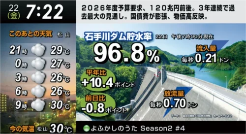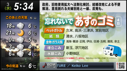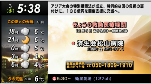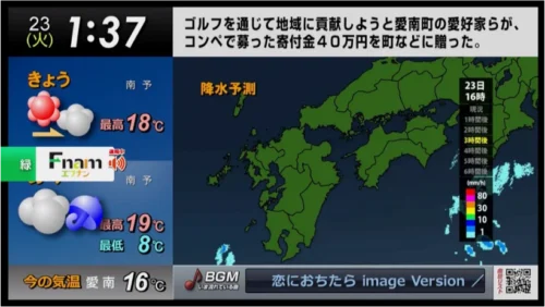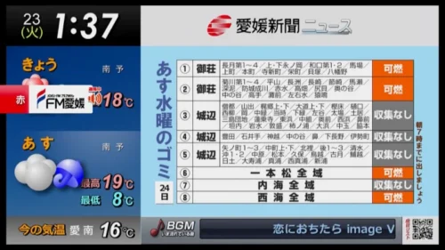 天気やゴミの日、ニュース、災害情報など、暮らしに役立つ情報をまとめてスライド形式にてお届けします。放送の音声はリモコン操作でカンタンにラジオへ切り替えが可能。家事の時間のBGMとしても最適なチャンネルです。
