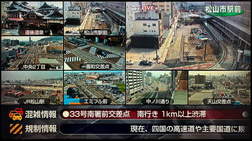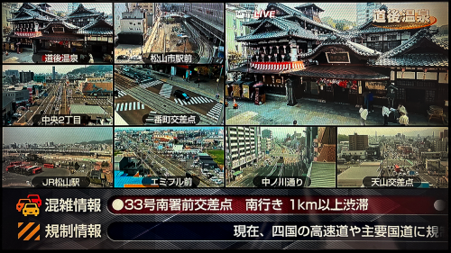松山市内の主要交差点などに設置した15台のカメラ映像を、一画面でチェック! 観光名所や渋滞が気になる交差点の状況などをリアルタイムで確認できるほか、画面下部では交通規制や通行止めの情報も表示します。